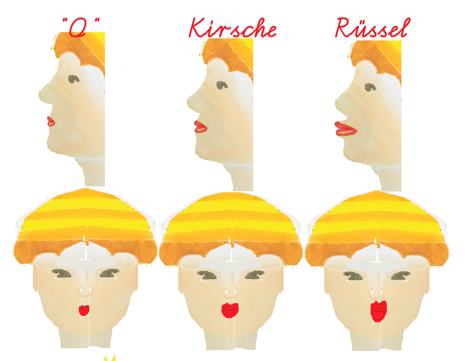 "O"-Kirsche-Rüssel | 1. Lippen uzu einem Punkt zusammenziehen 2. Zu einer Kirsche vorschieben 3. Ganz weit vorspitzen zu einem Rüssel |