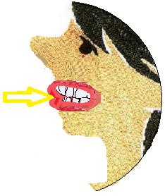 - das ist ganz unnütz und biegt den Zaun ringsum nach aussen. Oder die Zunge biegt die obere Front vorwärts-aufwärts, die untere abwärts. - Hier auf dem Bild kann man sehen, wie das aussieht. Und, Du wirst es nicht glauben, die Seitenzähne stehen fest aufeinander und vorne können sie nicht mehr zusammen kommen (und nichts mehr abbeissen), Das sieht dann genau so aus, als hättest Du Deinen Daumen genuckelt.