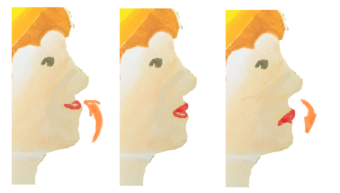 1.Lippen ganz eng und flach zusammenziehen. Das "O" 2.Lippen normal aber mit Kraft. Die "Kirsche" 3. Lippen weit vorwärts - mit viel Kraft = Der "Rüssel="